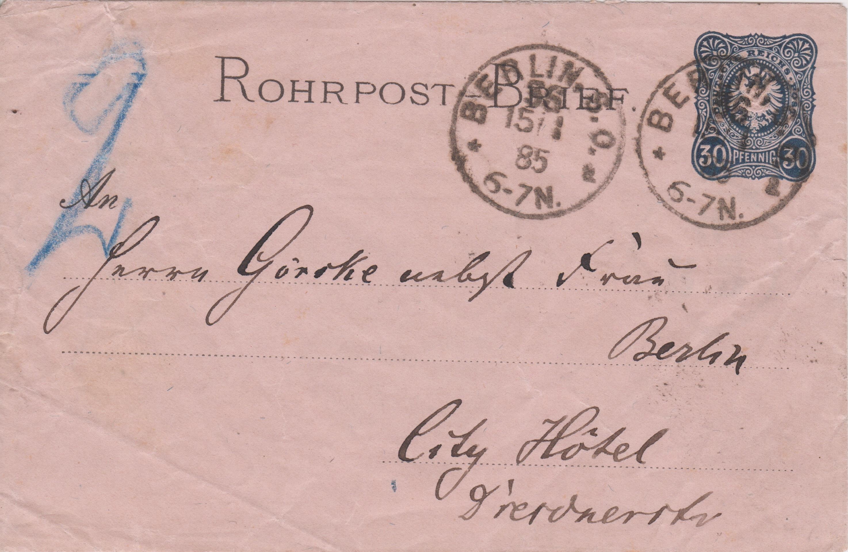 Ganzsache "ROHRPOST-BRIEF", adressiert "City Hotel Dresdnerstr", aufgegeben am 15.01.1885 in BERLIN, S. O. 36:
