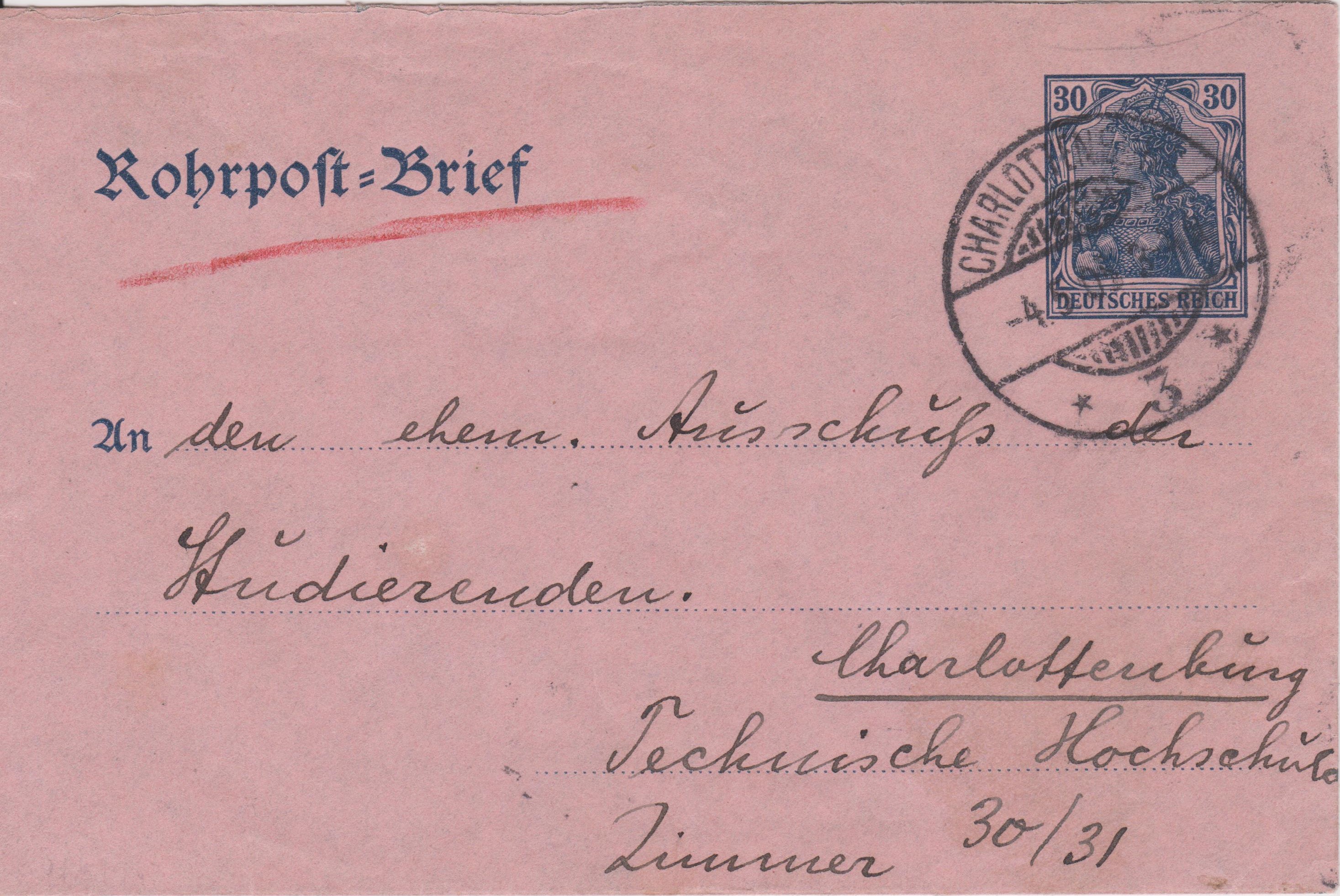 "Rohrpost=Brief", aufgegeben am 04.05.1905 in CHARLOTTENBURG 3, per Rohrpost befördert nach CHARLOTTENBURG 2 und dort durch den Eilboten "1" dem Empfänger zugestellt: