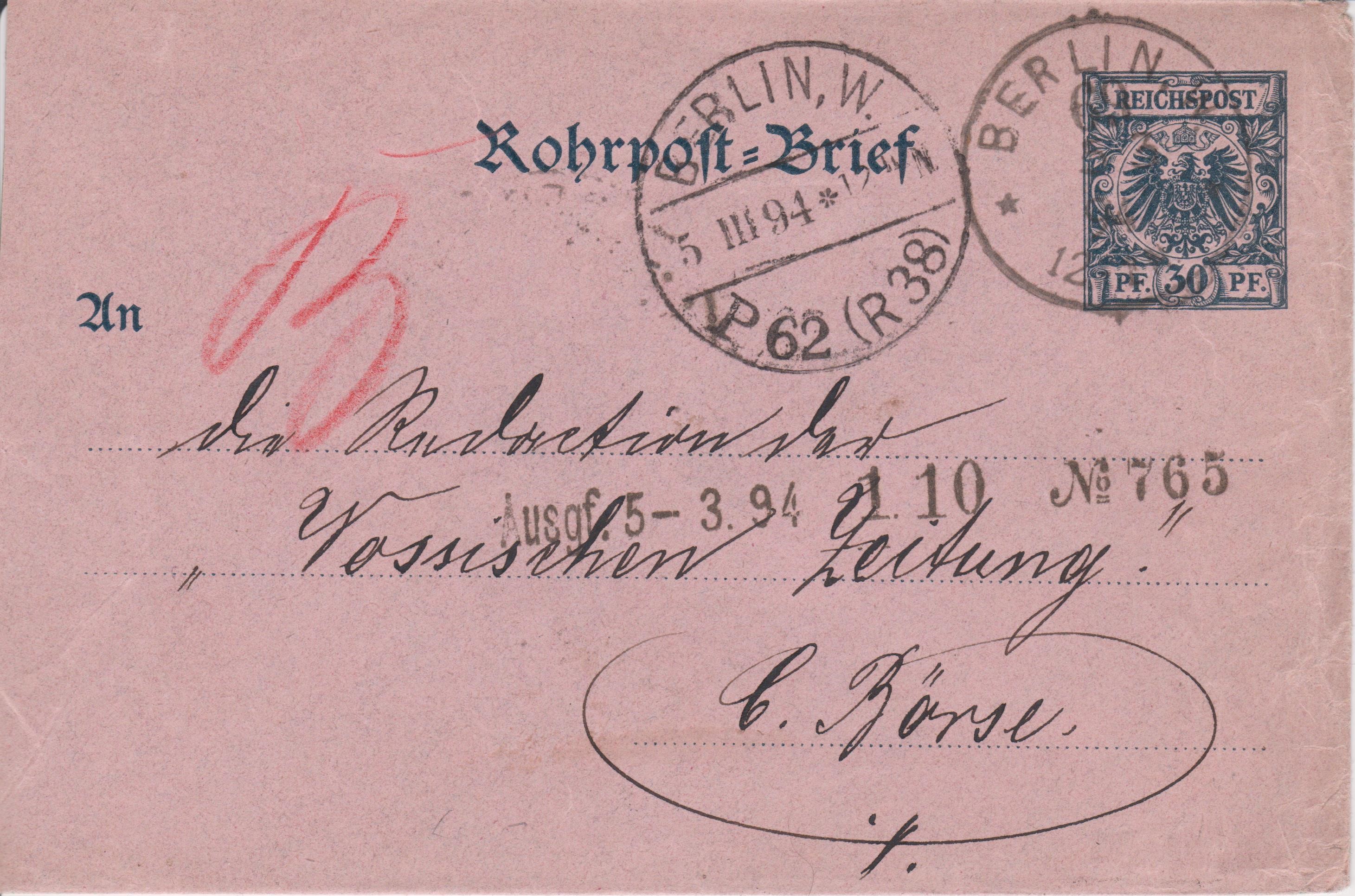 "Rohrpost=Brief", adressiert "C. Börse" aufgegeben am 05.03.1894 in BERLIN, handschriftlicher Leitvermerk in Rot "B", per Rohrpost befördert via BERLIN, W. P 62 (R 38) nach BERLIN, C. T. A. 2:
