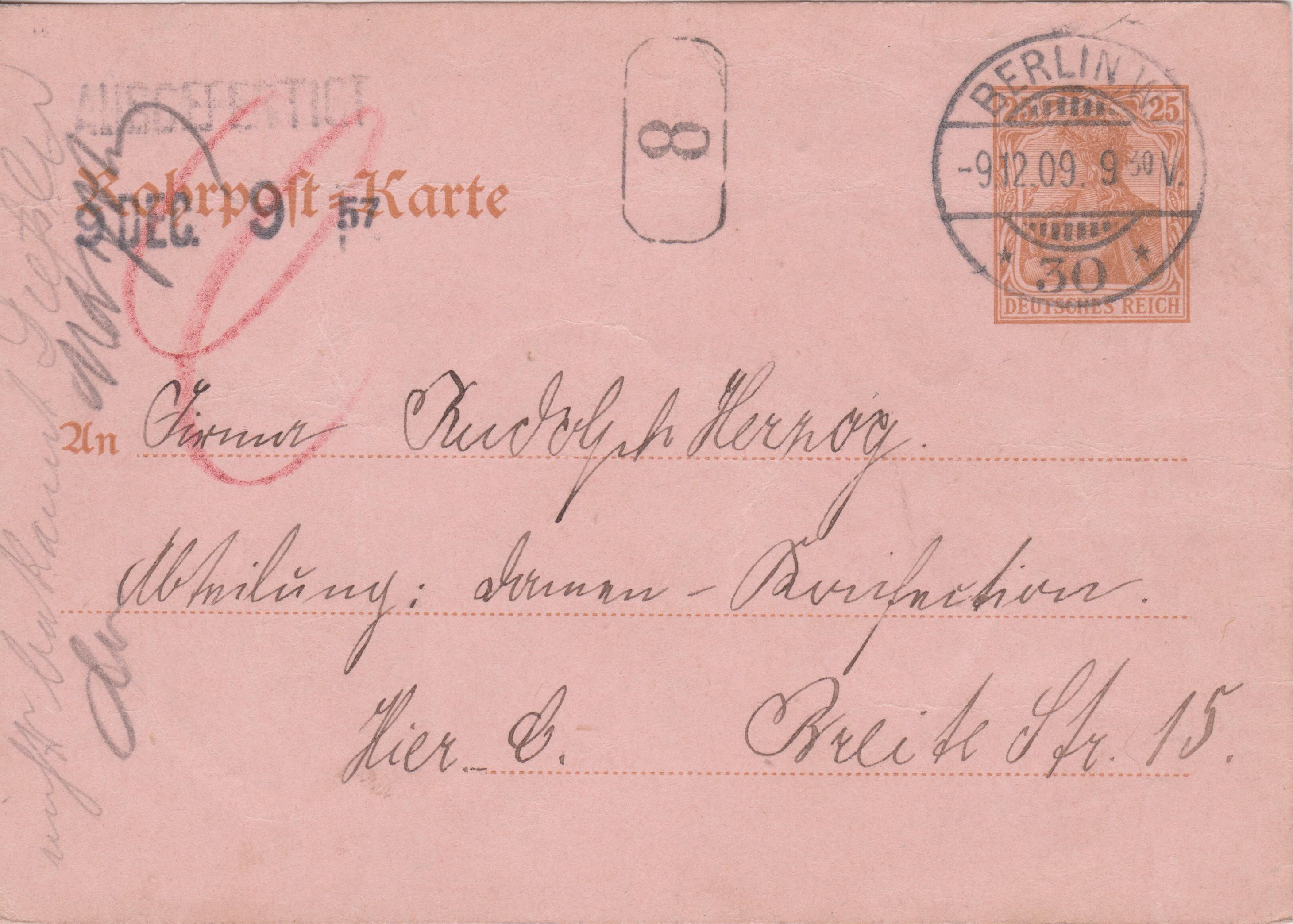 "Rohrpost=Karte", adressiert nach "C" (= Charlottenburg), aufgegeben am 09.12.1909 in BERLIN, W. 30, zugestellt per Eilbote "8":