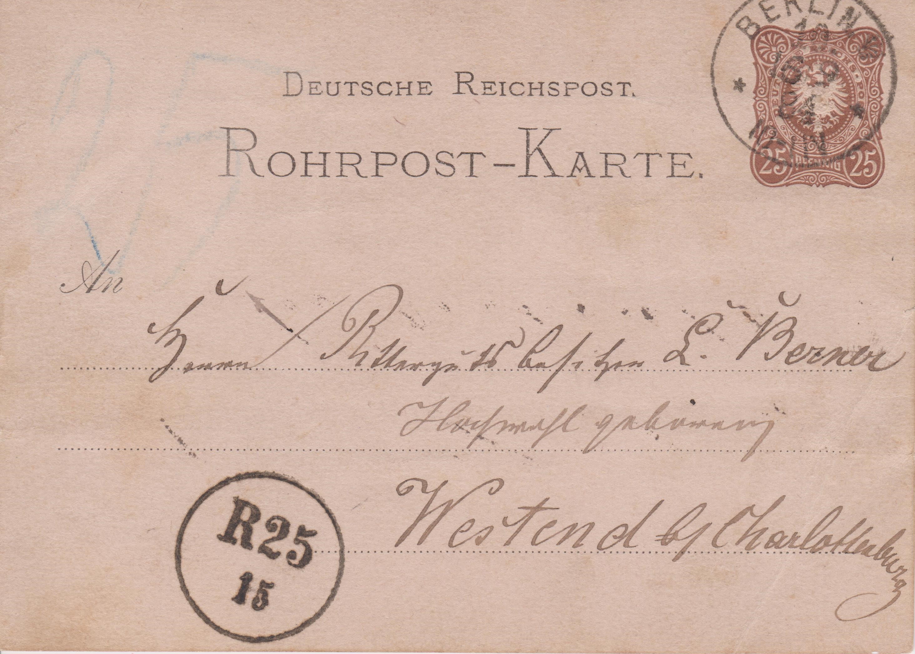 "Rohrpost=Karte", aufgegeben am 21.07.1907 in BERLIN, W. 57, per Rohrpost befördert nach "Ch" = CHARLOTTENBURG P1 (R 25):