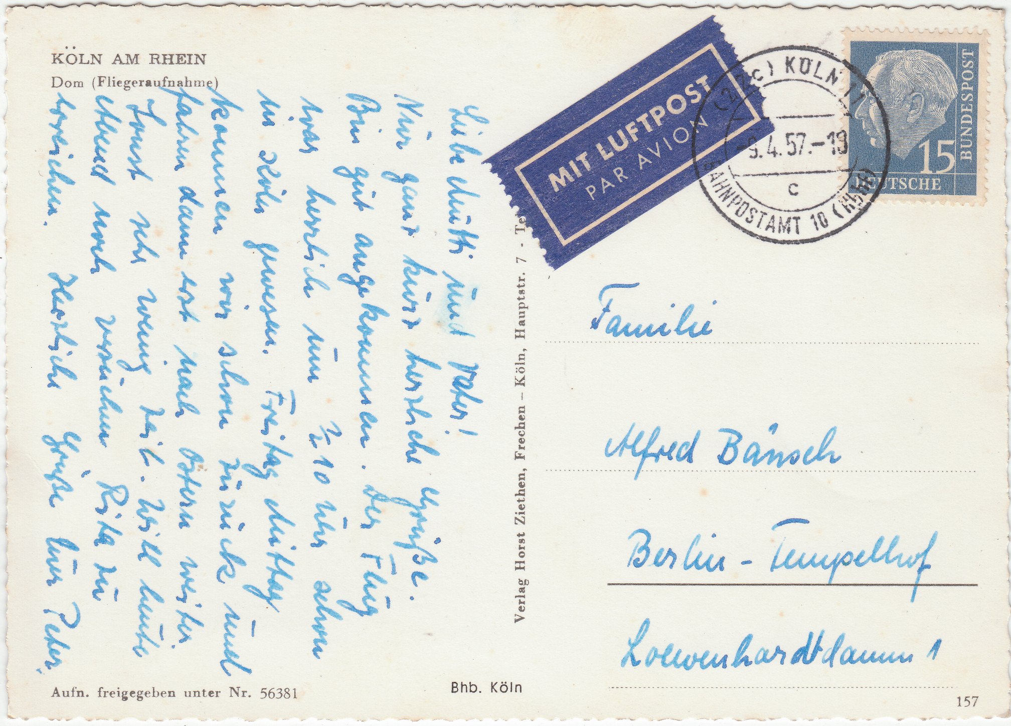 Diese Postkarte im Fernverkehr (10 Pf) per Luftpost (5 Pf), portogerecht frankiert per EF mit 15 Pf Heuss wurde am 09.04.1957 beim Bahnpostamt 10 im Hauptbahnhof in Köln aufgegeben und dokumentiert somit die Flugstrecke Köln-Berlin: