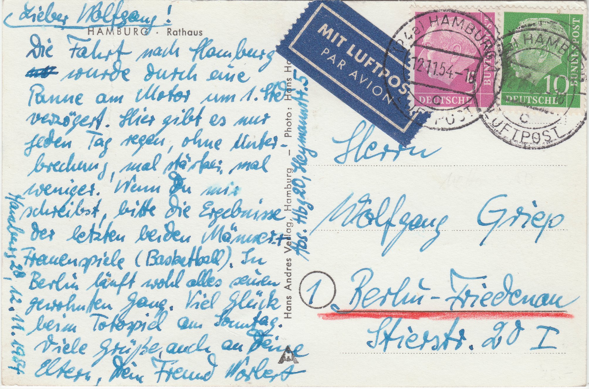 Diese Postkarte im Fernverkehr (10 Pf) per Luftpost (5 Pf), portogerecht frankiert per EF mit 15 Pf Heuss wurde am 23.09.1954 in Hamburg aufgegeben und dokumentiert somit die Flugstrecke Hamburg-Berlin: