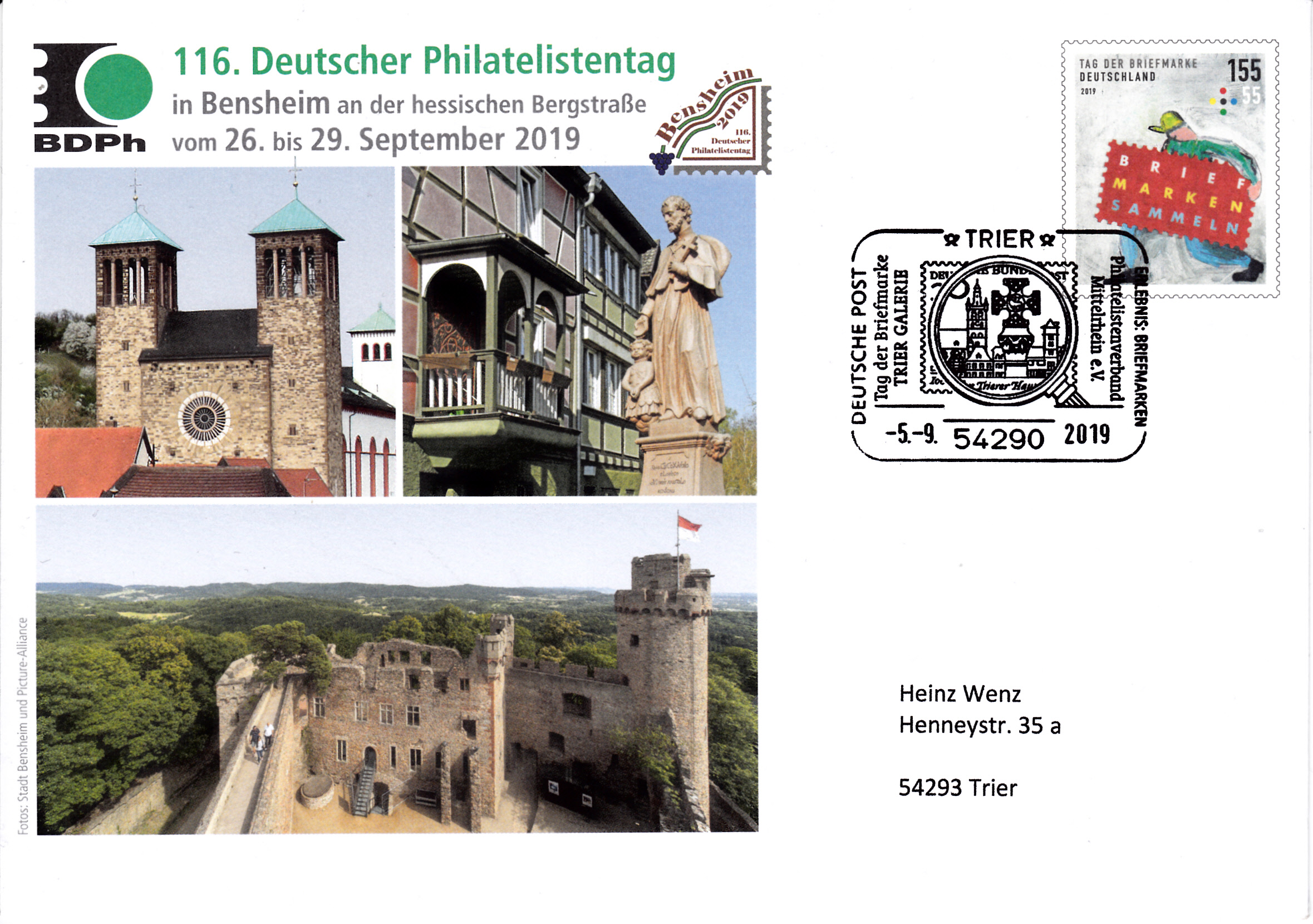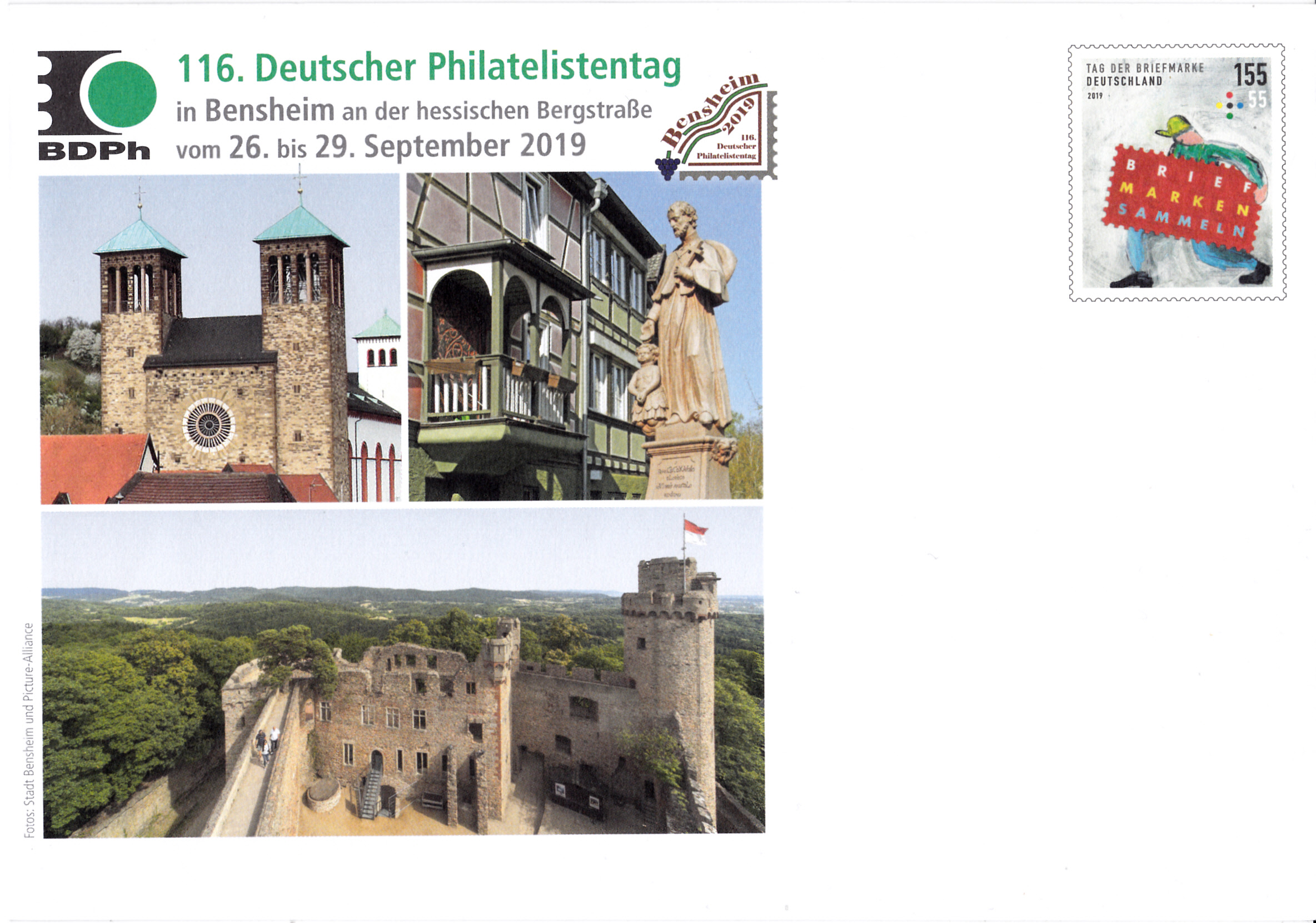 Zu dieser Ganzsache passt natürlich auch der Sonderstempel zum Tag der Briefmarke vom 26.9.2019 aus Bensheim.