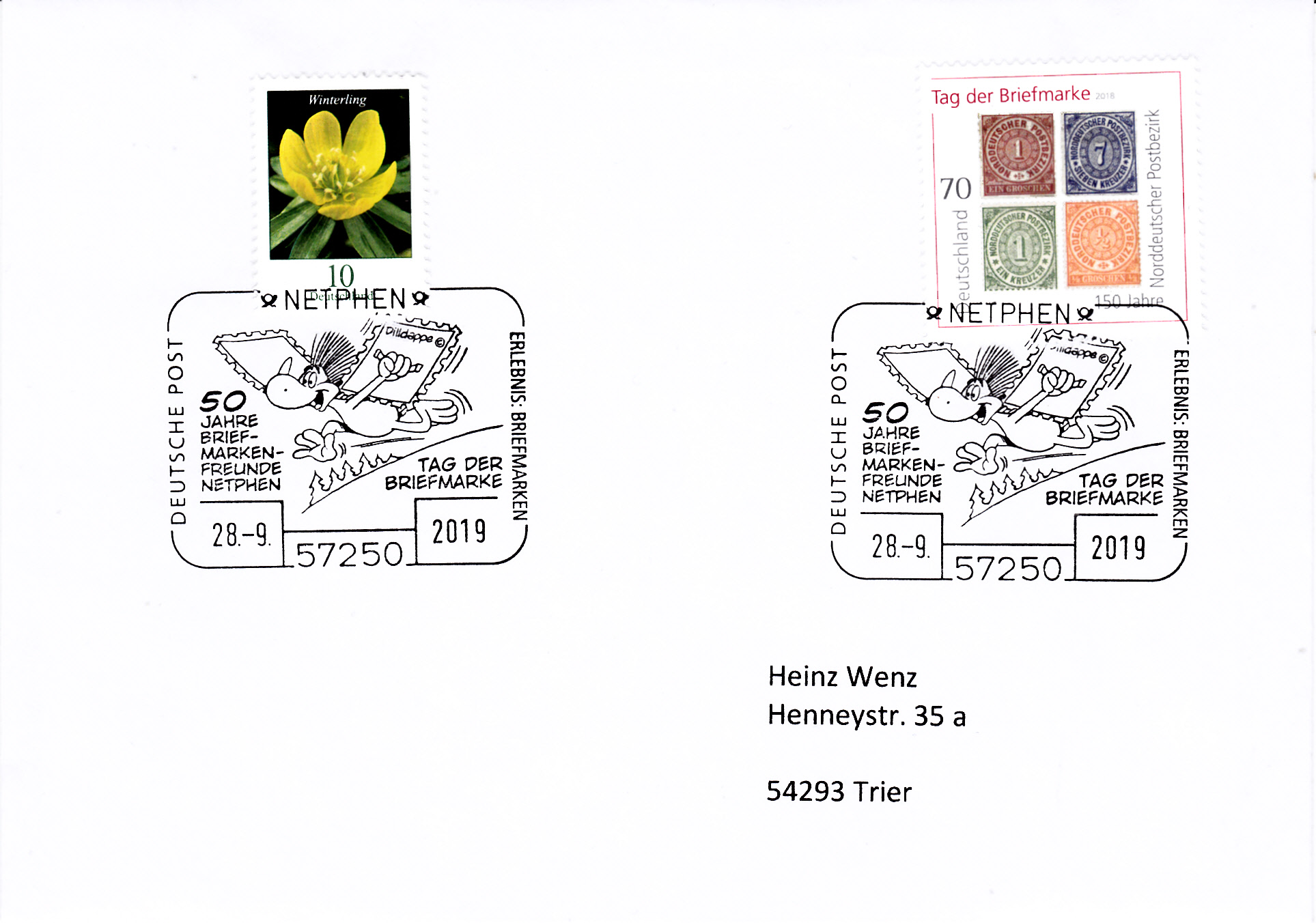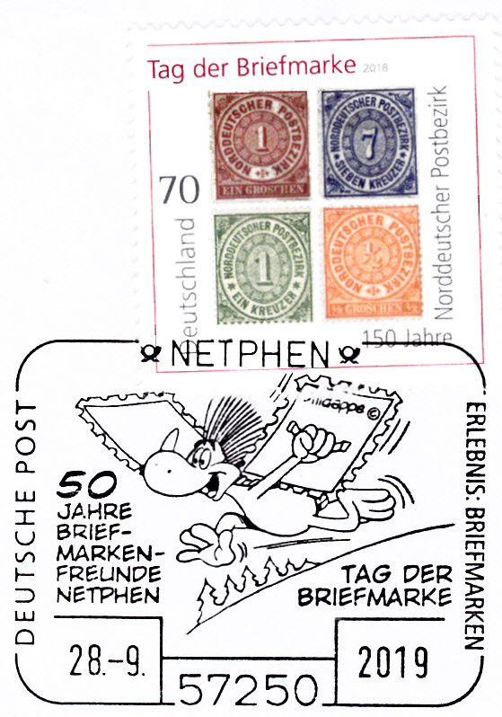 Sonderstempel aus Netphen vom 28.9.2019 zum Tag der Briefmarke mit einer Abbildung der Comicfigur Dilldappe.