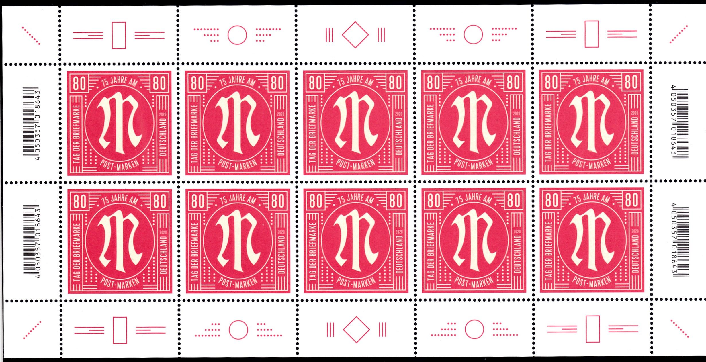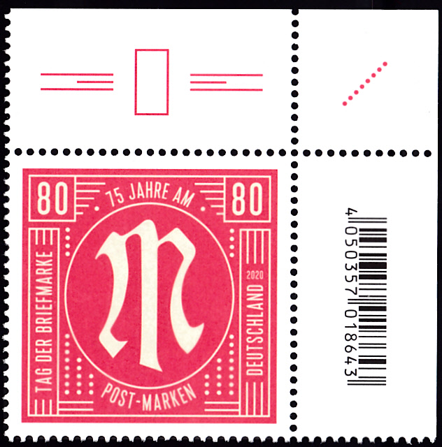 Bei der Deutschen Post ist zum Tag der Briefmarke 2020 eine Marke zu 80 Cent erschienen. Sie zeigt zum Jubiläum 75 Jahre AM-Post-Marken eine "Neuinterpretation des AM-POST-Markendesigns". Hier zeige ich ein Eckrandstück mit EAN-Codierung.