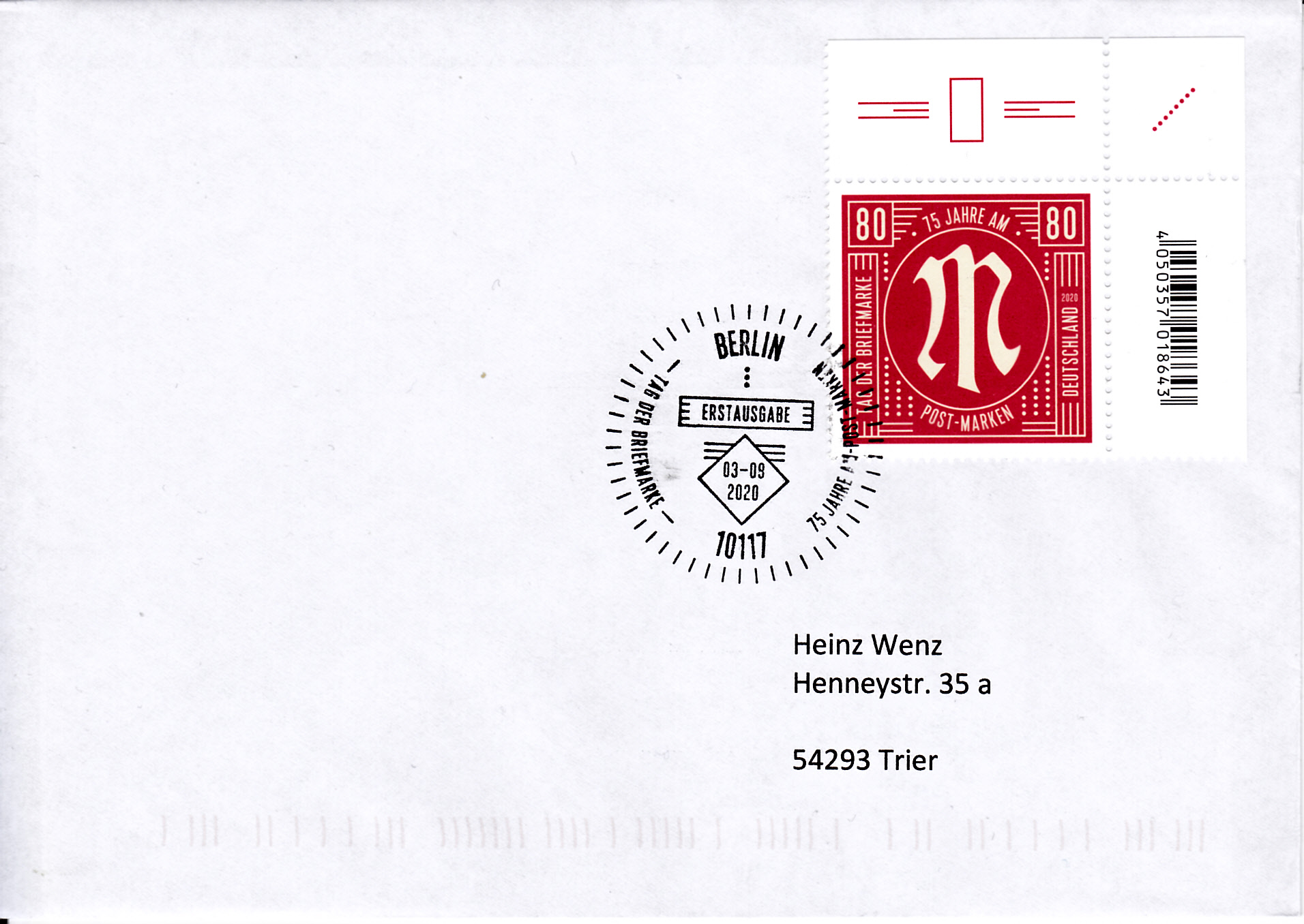 Brief der Marke zum Tag der Briefmarke 2020 und mit dem Ersttagsonderstempel Berlin.