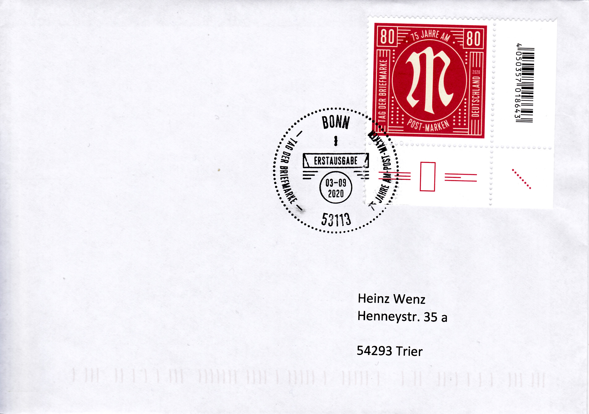 Brief der Marke zum Tag der Briefmarke 2020 und mit dem Ersttagsonderstempel Bonn.