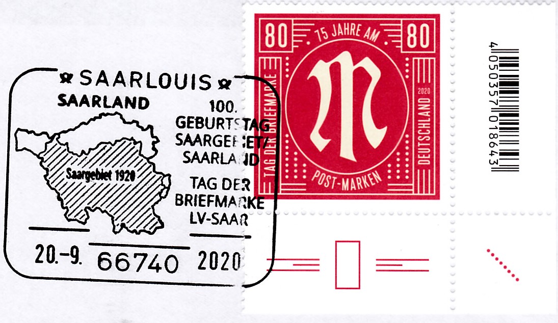 Sonderstempel des LV Saar ausn Saarlouis vom 20.9.2020 zum Tag der Briefmarke 2020.