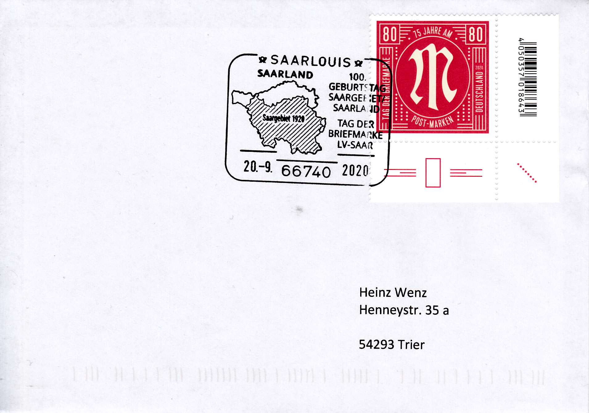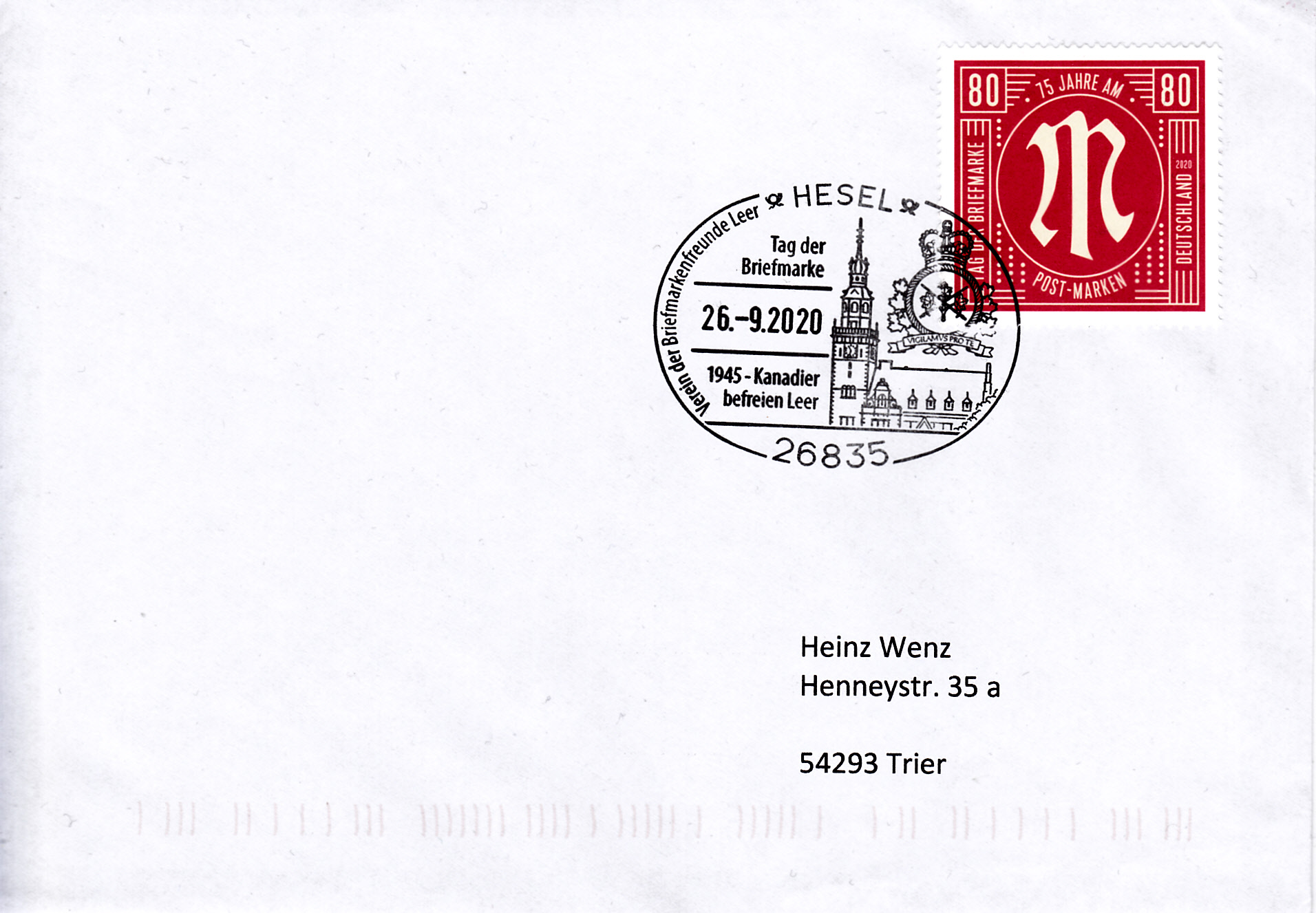 Auf diesem Brief wurde die Marke zum Tag der Briefmarke mit einem Sonderstempel vom 26.09.2020 aus Apolda gestempelt.
