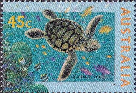 Auf dieser Marke aus Australien (MiNr 1505) ist eine Wallriffschildkröte (Natator depressus) zu sehen. Michel nennt sie noch Australische Suppenschildkröte (Chelonia depressa).