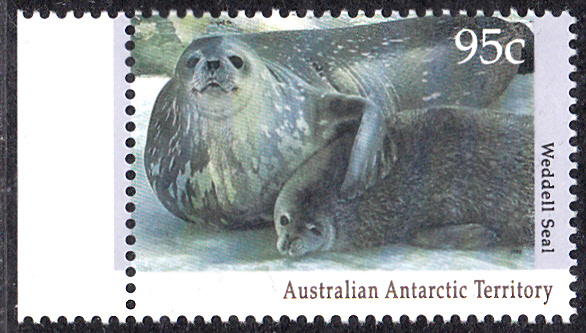 Auf dieser Marke aus den Australischen Gebieten in der Antarktis (MiNr 93) wird eine Weddellrobbe (Leptonychotes weddelli) mit ihrem Jungen gezeigt.