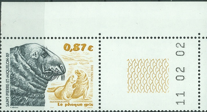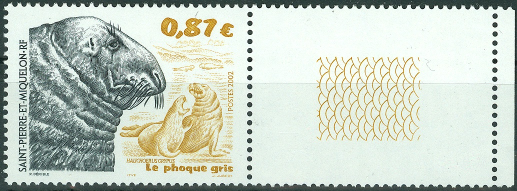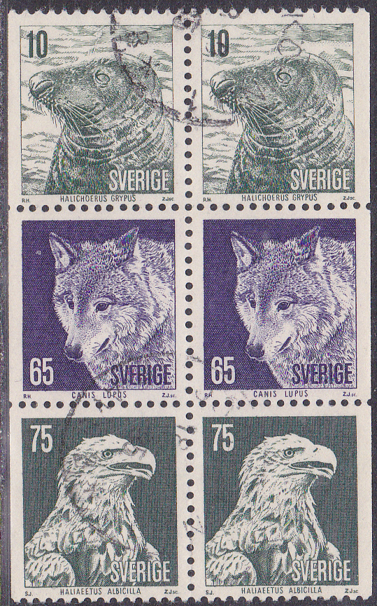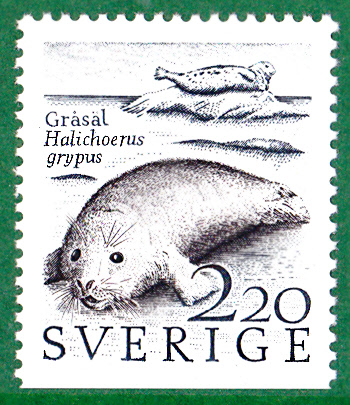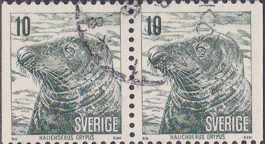 In Schweden ist 1973 in einem Markenheftchen "Tierschutz" eine Marke mit der Abbildung eines Kegelrobben (Halichoerus grypus) erschienen. Hier ein Paar aus diesem Heftchen (MiNr 820 yDl / 820 yDR). Die Marke gibt es in zwei Papierarten: x = normales Papier, y = Papier fl.