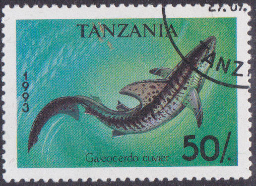 Diese Marke aus Tansania (MiNr 1585) bildet einen Tigerhai (Galeocerdo cuvier) ab.