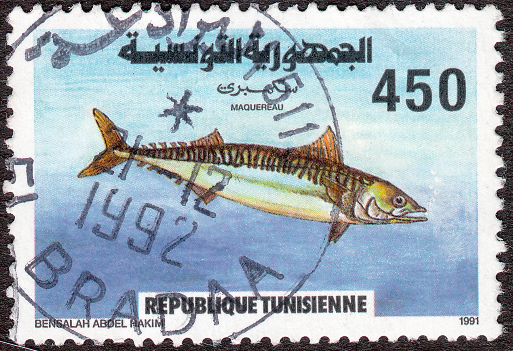 Hier eine Makrele = französisch MAQUEREAU auf einem Postwertzeichen aus Tunesien aus dem Jahre 1991: