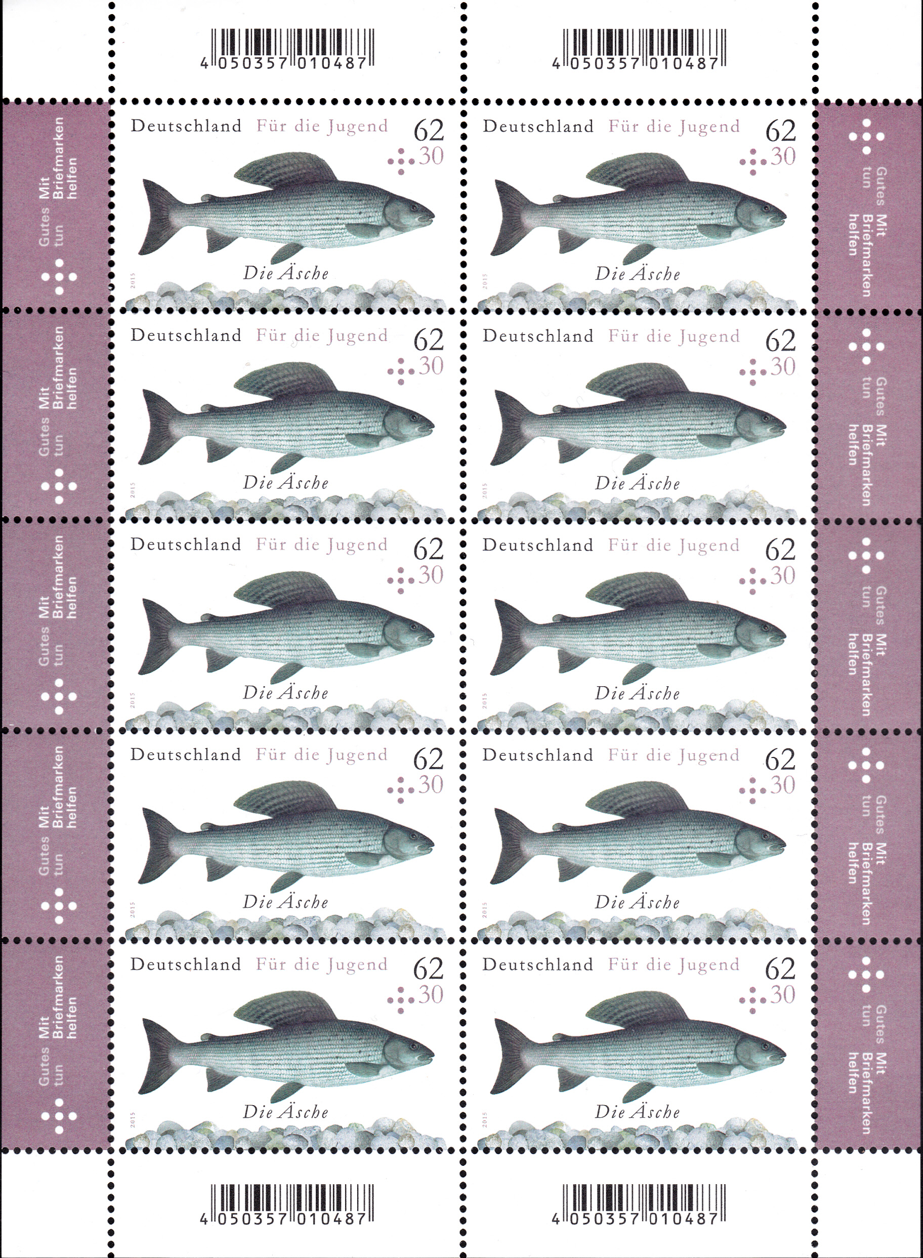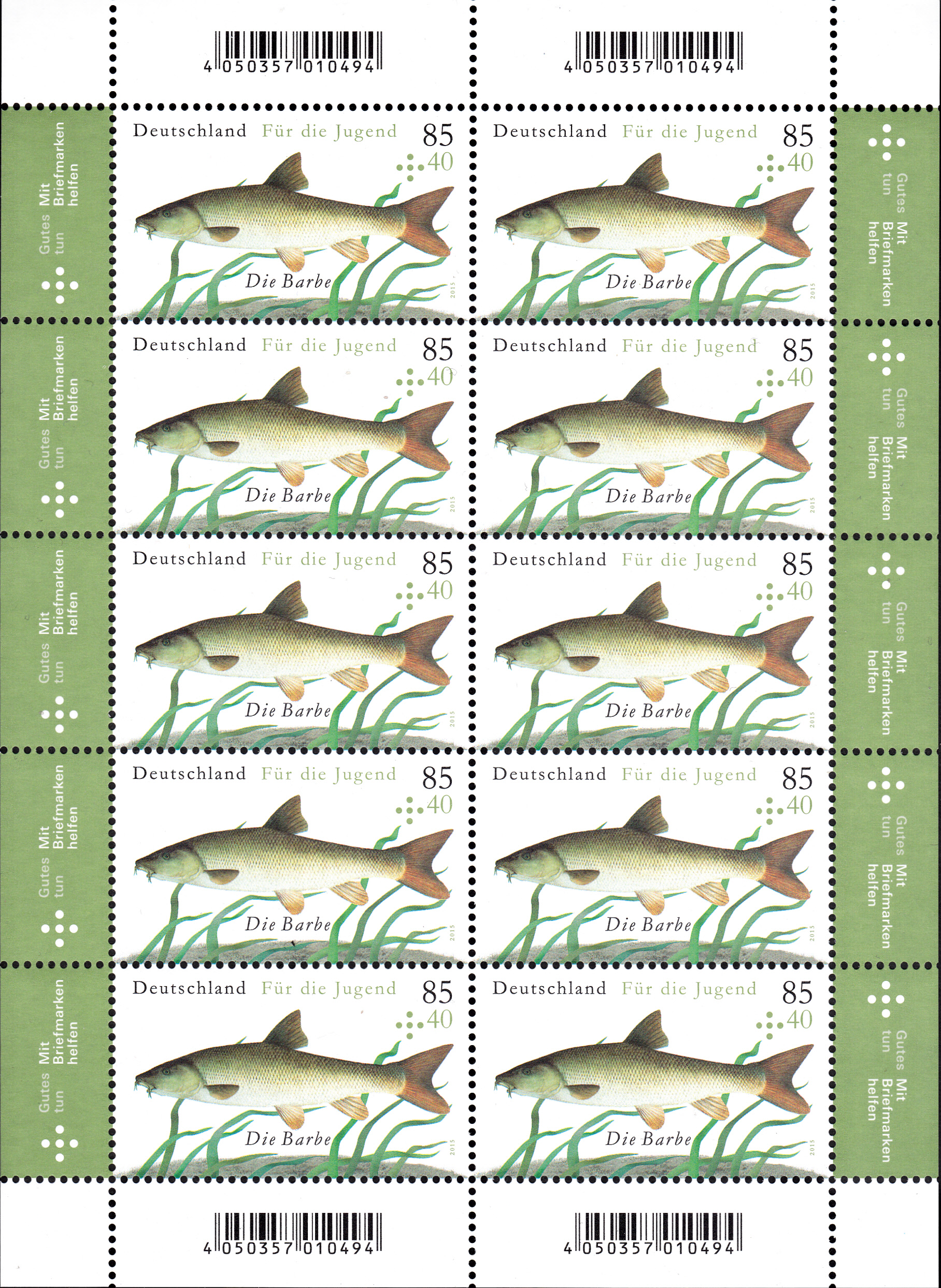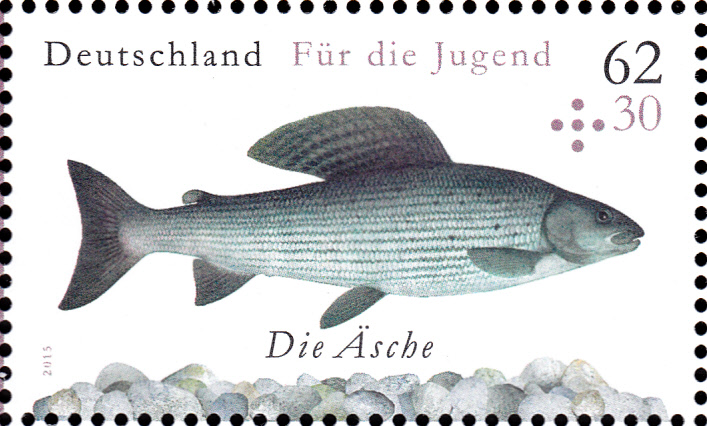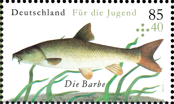 Auf der Jugendmarke 2015 zu 85+40 Cent (MiNr 3170) ist eine Barbe abgebildet.