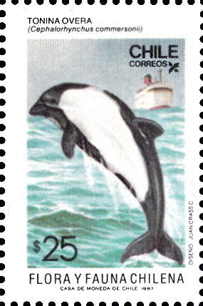 Auf dieser Marke aus Chile (MiNr 1195) kann man einen der kontrastreich gezeichnete Commerson-Delfin (Cephalorhynchus commersonii) sehen.