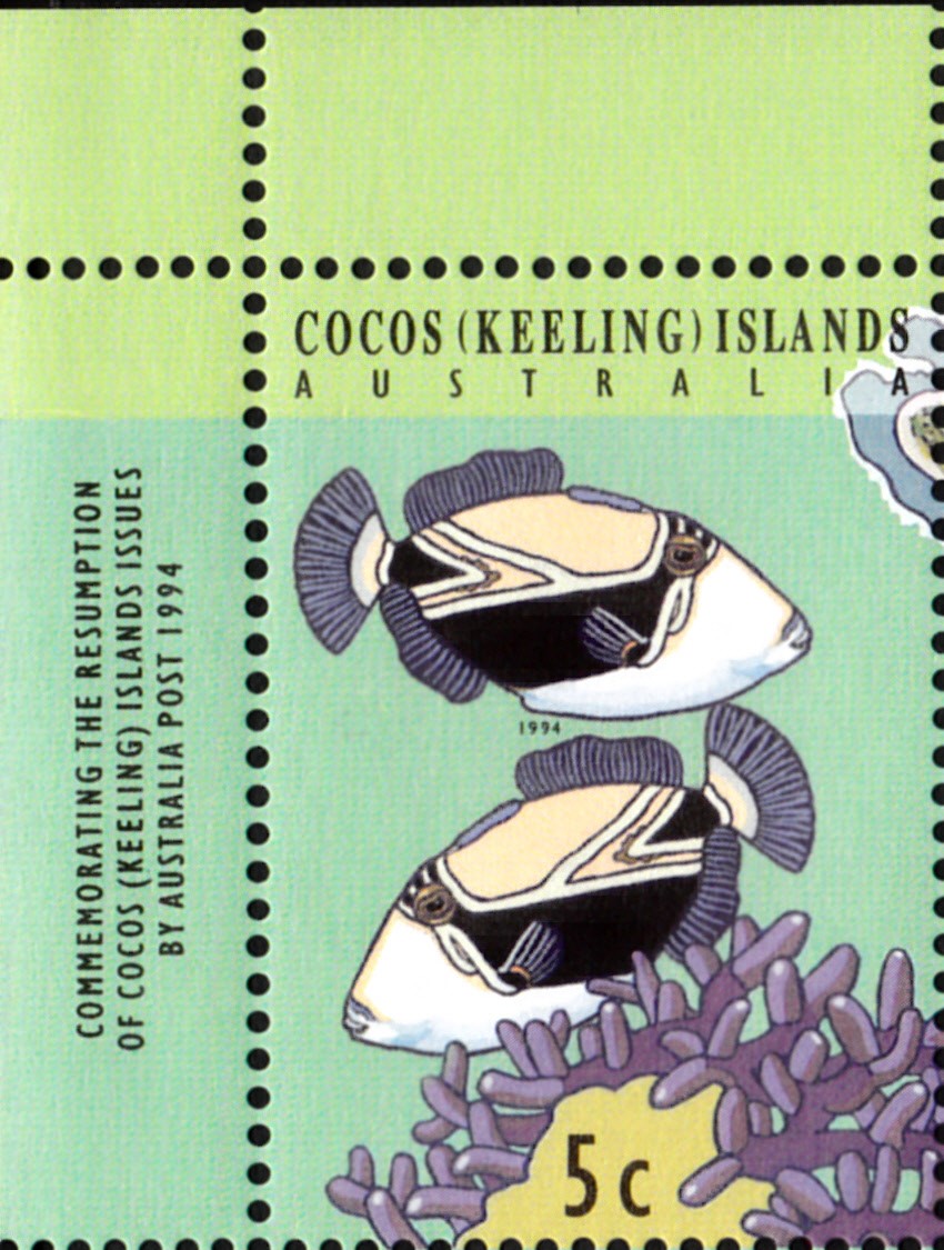 Auf dieser Marke der Kokos-Inseln (MiNr 314) sind neben einer Suppenschildkröte auch vier Gelbe Pyramidenfalterfisch (Hemitaurichthys polylepis) zu sehen.