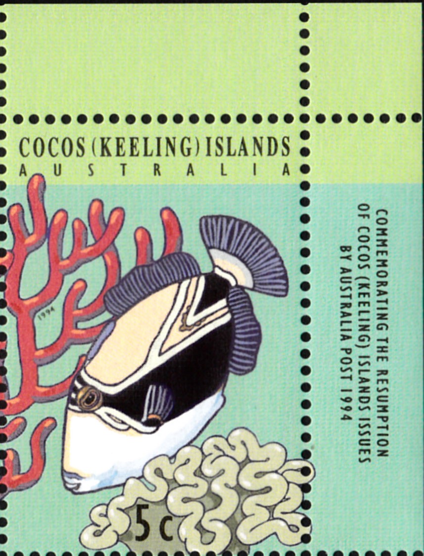 Auf den Kokos-Inseln sind Marken mit Diamant-Picassodrückerfischen (Rhinecanthus rectangulus) erschienen. Im Michel wird als Name Harlekin-Drückerfische (Rhinecanthus rectangulus) genannt. Hier eine der Marke (MiNr 305) mit zwei dieser Fische.