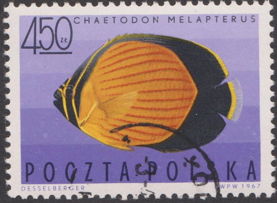 Dieses Postwertzeichen Polen MiNr. 1754 zeigt ein Exemplar der Art Arabischer Rippen-Falterfisch = Chaetodon melapterus: