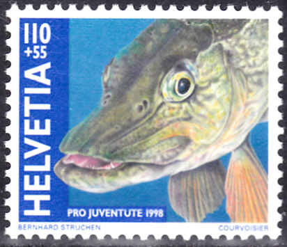 Aus der Schweiz kommt diese Marke mit dem Kopf eines Hechtes (Esox lucius).