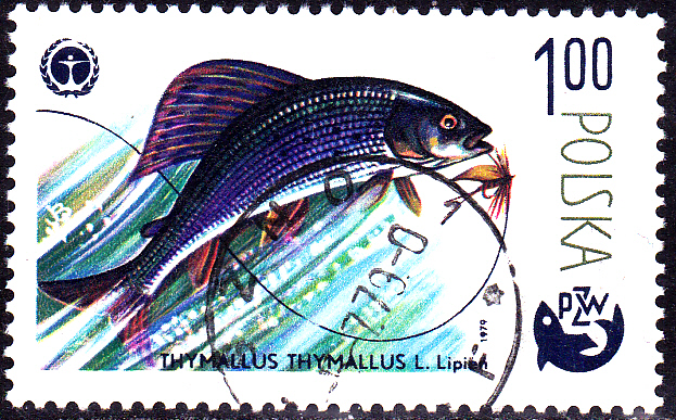 In der gleichen Serie "100 Jahre Sportangeln" aus Polen gibt es auch eine Marke (MiNr 2618) mit einer Europäische Äsche (Thymallus thymallus).