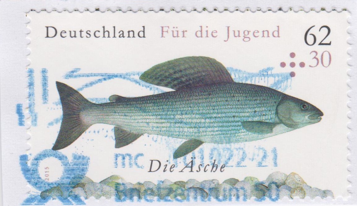 Briefstück mit der bei der Deutschen Post AG in der Jugendmarkenserie 2015 erschienenen Wertstufe zu 62+30 Cent, MiNr. 3169, zeigt als Motiv "Die Äsche":