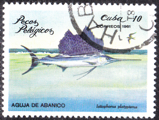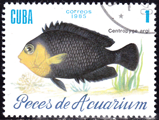 Eine Marke aus Kuba (MiNr 2202) zeigt einen Feuermaulbuntbarsch (Thorichthys meeki).