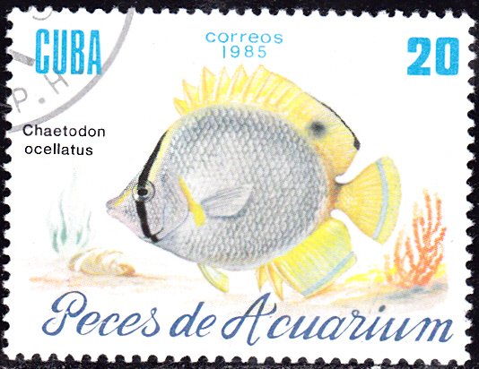 Auf dieser Marke aus Kuba (MiNr 2969) ist ein Nördlicher Falterfisch (Chaetodon ocellatus) zu sehen. Michel nennt als Name Gaukler (Chaetodon ocellatus).