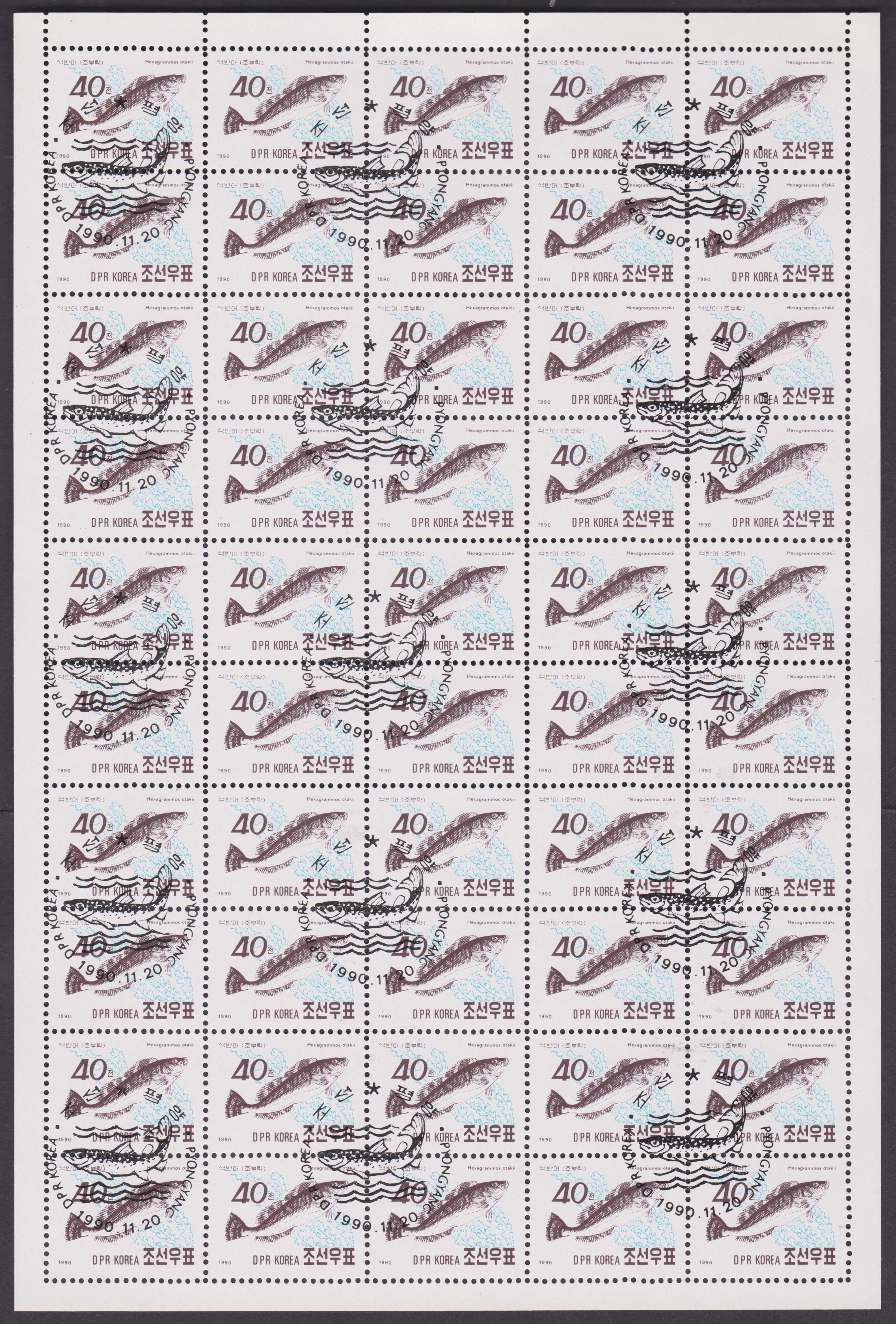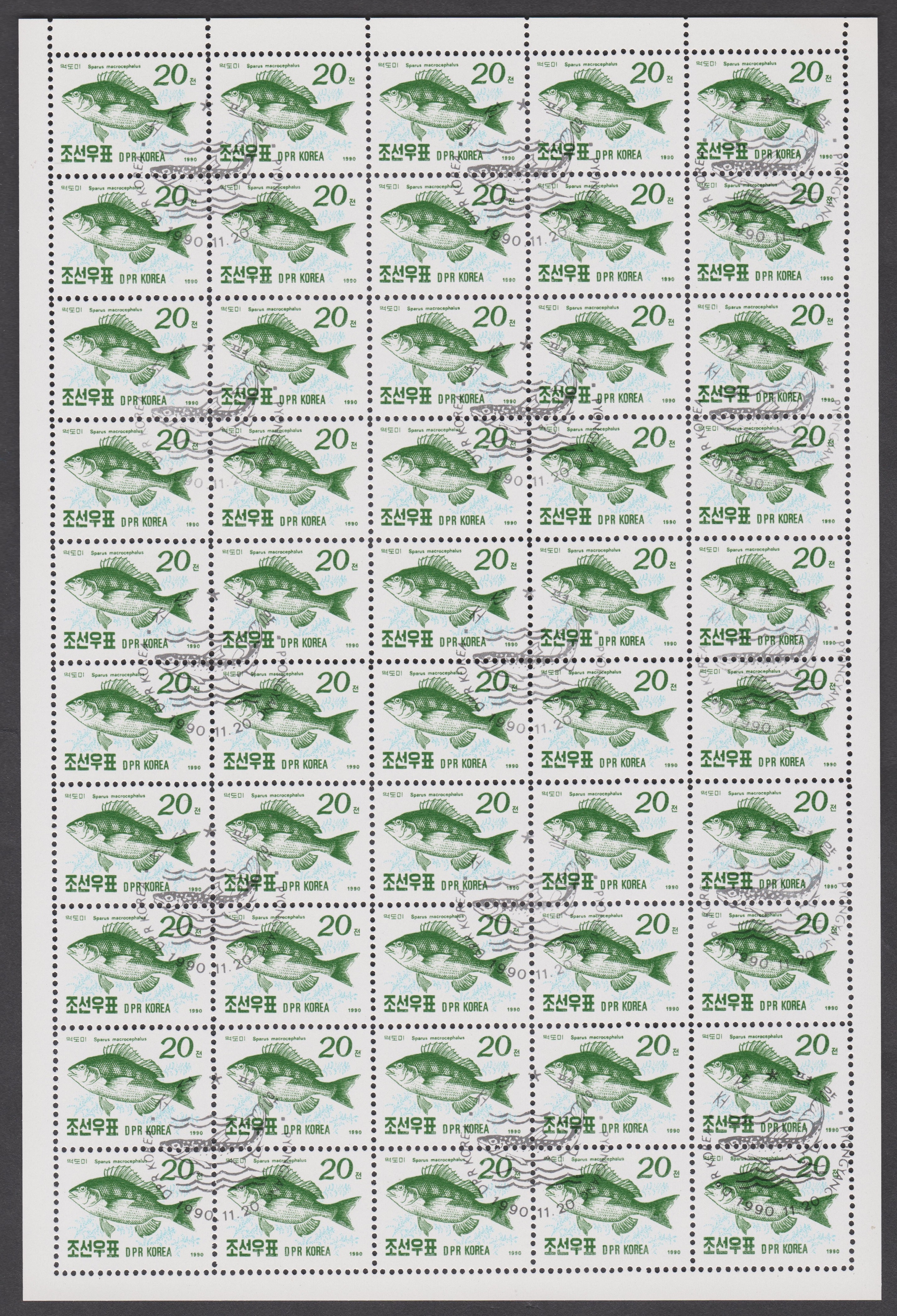 Dieses Postwertzeichen aus Korea, Nordkorea MiNr. 3155, zeigt einen Barsch, Sparus macrocephalus, hier im Originalbogen mit Ersttagsstempel vom 20.11.1990: