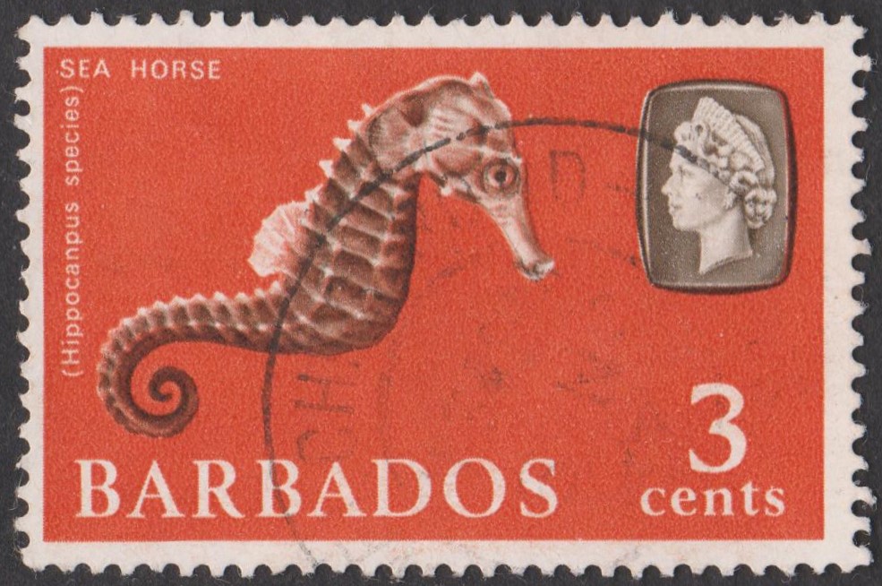 Dieses Postwertzueichen aus BARBADOS zeigt ein Seepferdchen Hippocampus species: