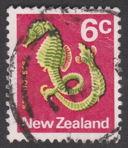 Dieses Postwertzeichen aus Neuseeland zeigt "SEA HORSES" = Seepferdchen: