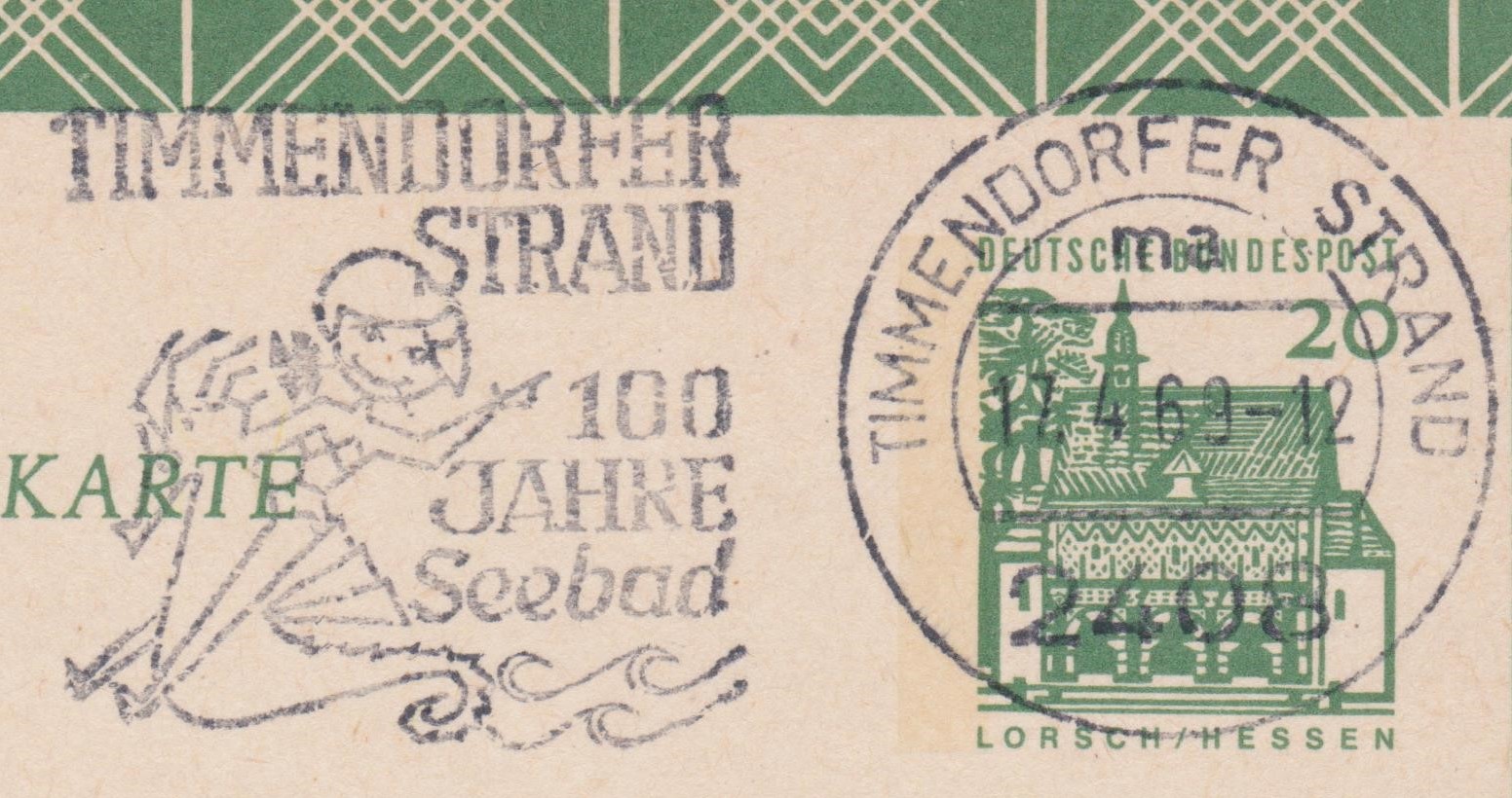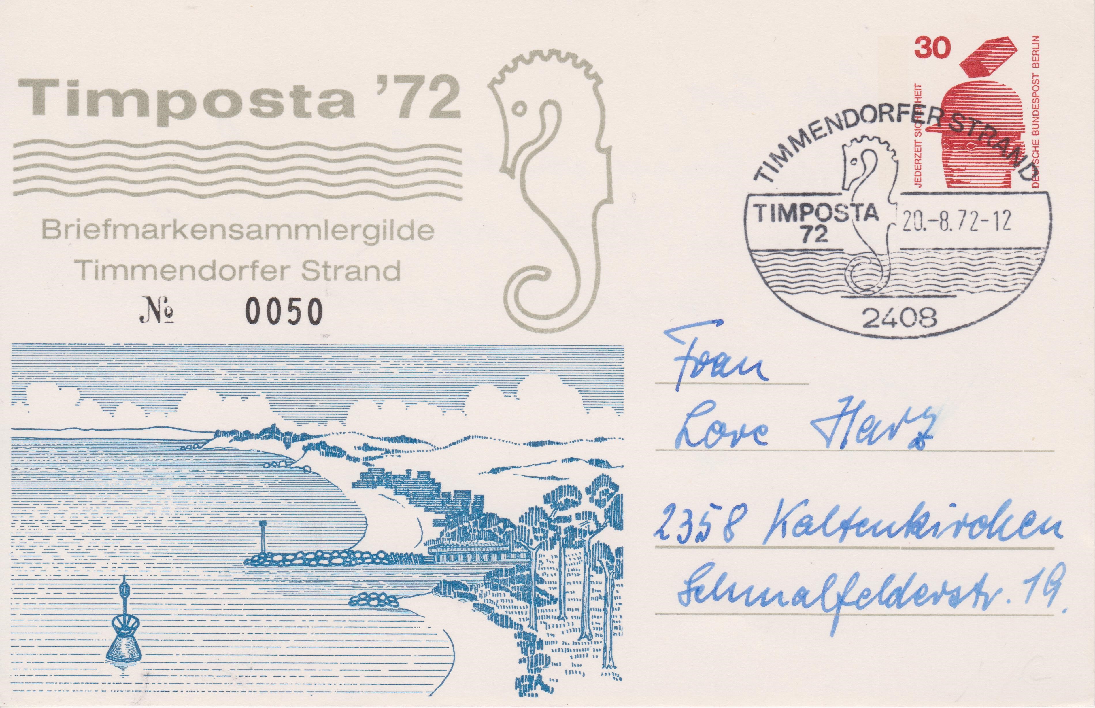 Nummerierte Ganzsache zur Timposta ´72 mit Sonderstempel TIMMENDORFER STRAND, beide mit der Darstellung eines Seepferdchens: