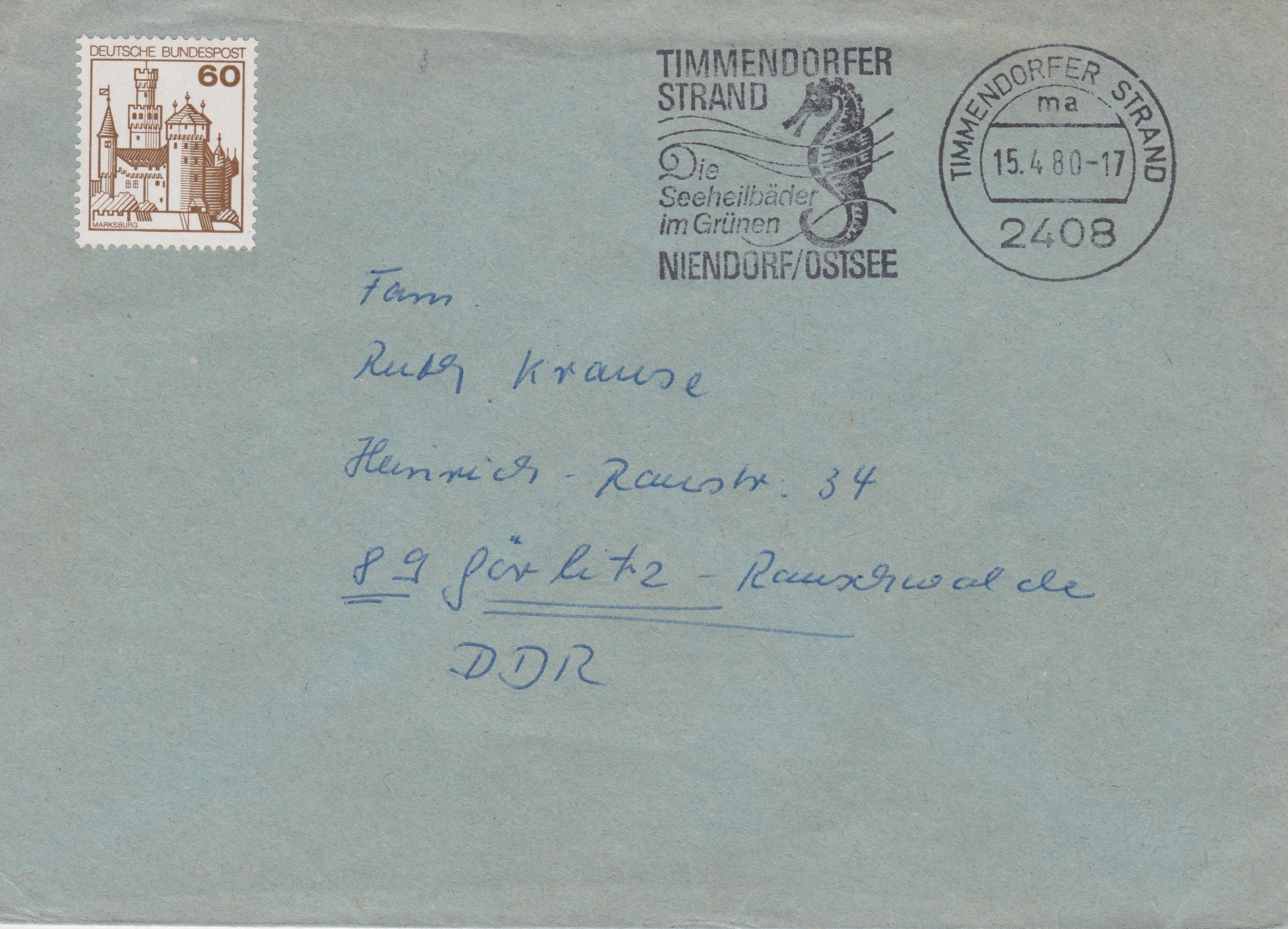 In die DDR adressierter Brief vom 15.04.1980 mit Maschinenstempel 2408 TIMMENDORFER STRAND ma mit einem Seepferdchen im Werbeeinsatz: