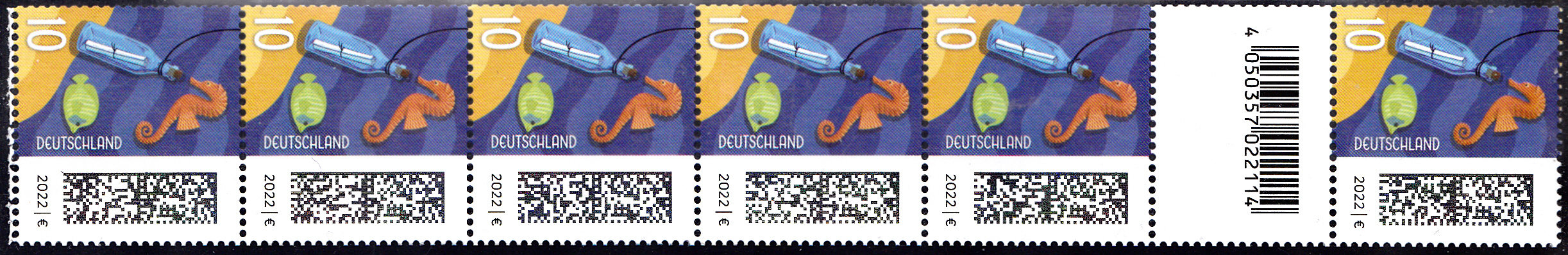 Die Marke zu 10 Cent der Freimarkenserie "Welt der Briefe" (MiNr 3723) mit dem Motiv "Flaschenpost mit Rotem Seepferdchen (Hippocampus kuda) wurde auch in Rollen zu je 200 Stück gedruckt. Jede 5. Marke der Rolle ist rückseitig nummeriert, auf diese folgt ein Zwischenfeld mit EAN-Codierung.