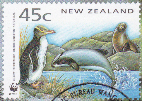 Aus Neuseeland kommt eine Marke (MiNr 1290) mit einem Gelbaugenpinguin (Megadyptes antipodes), einem Hectordelphin (Cephalorhynchus hectori) und einem Australischen Seebär (Arctocephalus forsteri).