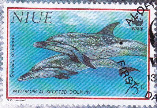 Aus Niue (eine isolierte Koralleninsel im Südpazifik in der Nähe von Tonga, 2400 km nordöstlich von Neuseeland, südlich von Samoa und westlich der Cookinseln) kommt eine Marke (MiNr 822) mit zwei Rauzahndelfinen (Steno bredanensis).