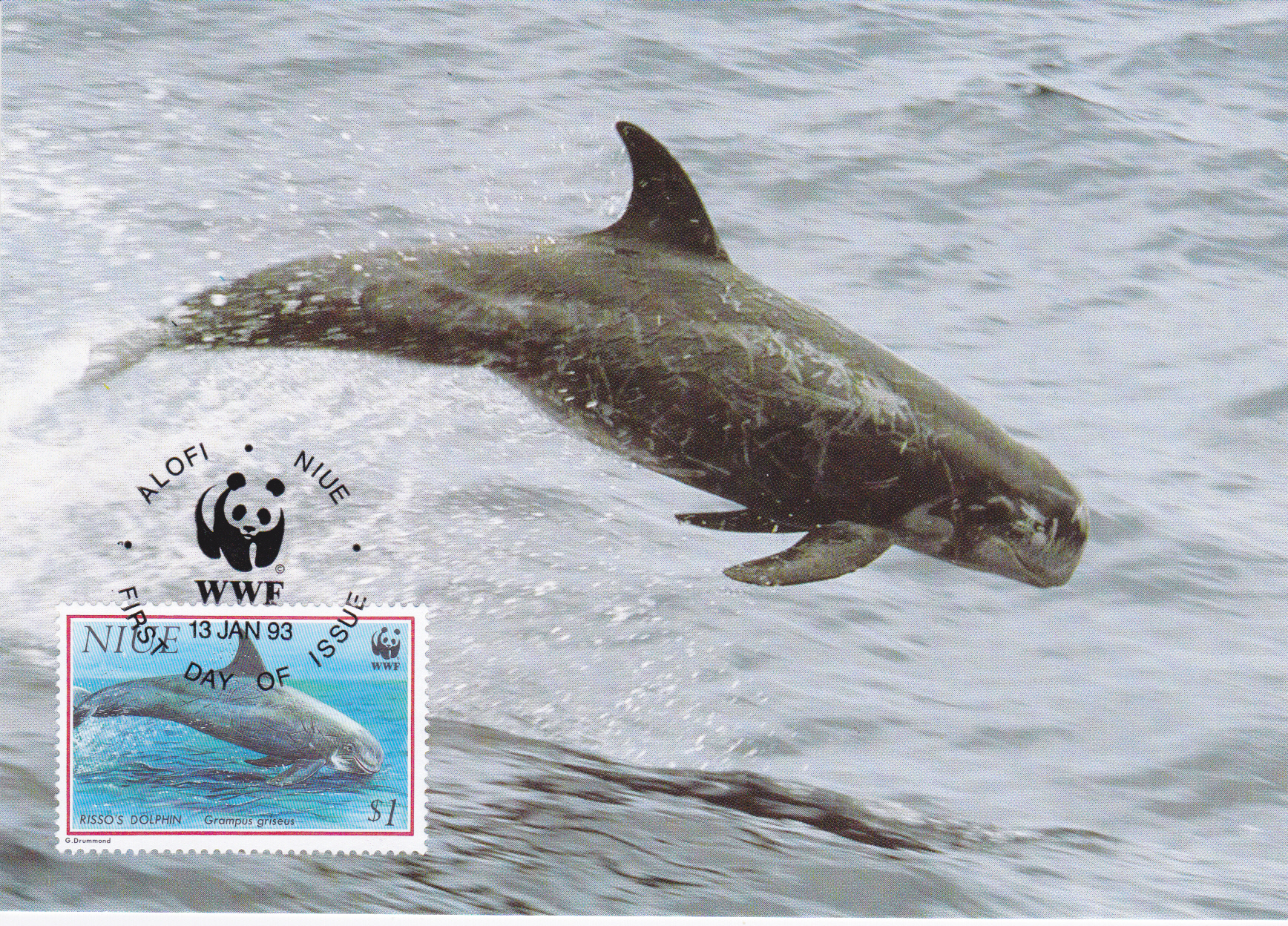 Auf dieser Marke aus Niue (MiNr 825) wird der schon hier vorgestellte Rundkopfdelfin (Grampus griseus) gezeigt.