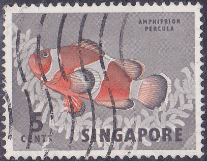 Auf dieser Marke aus Singapur (MiNr 56) wird ein Echter Clownfisch (Amphiprion percula) gezeigt.