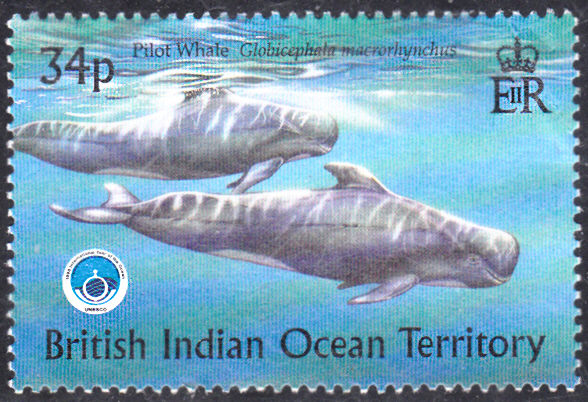 Diese Marke (MiNr 229) aus dem Britischen Territorium im Indischen Ozean (ein britisches Überseegebiet im Indischen Ozean, das heute nur noch den Chagos-Archipel umfasst) zeigt zwei Kurzflossen-Grindwale (Globicephala macrorhynchus).