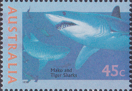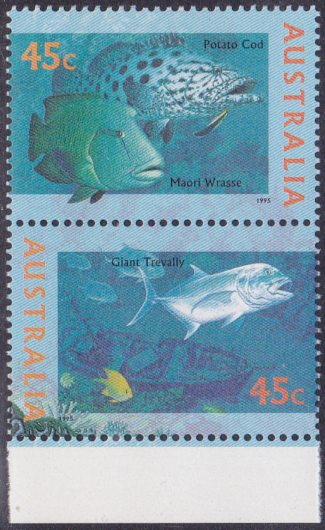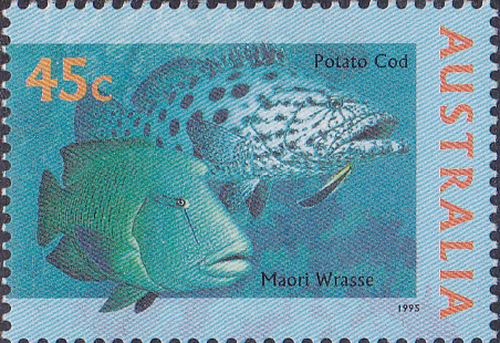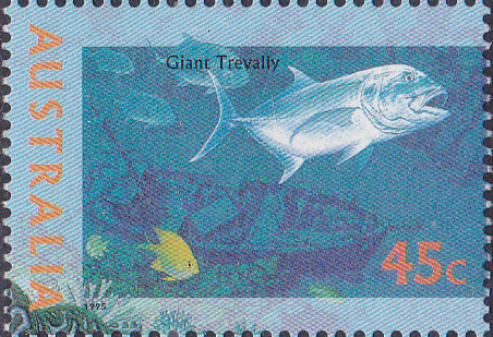 Auf dieser Marke aus Australien (MiNr 1508) ist eine Dickkopf-Stachelmakrele (Caranx ignobilis) abgebildet. Bei Michel wird sie Große Pferdemakrele (Caranx ignobilis) genannt.