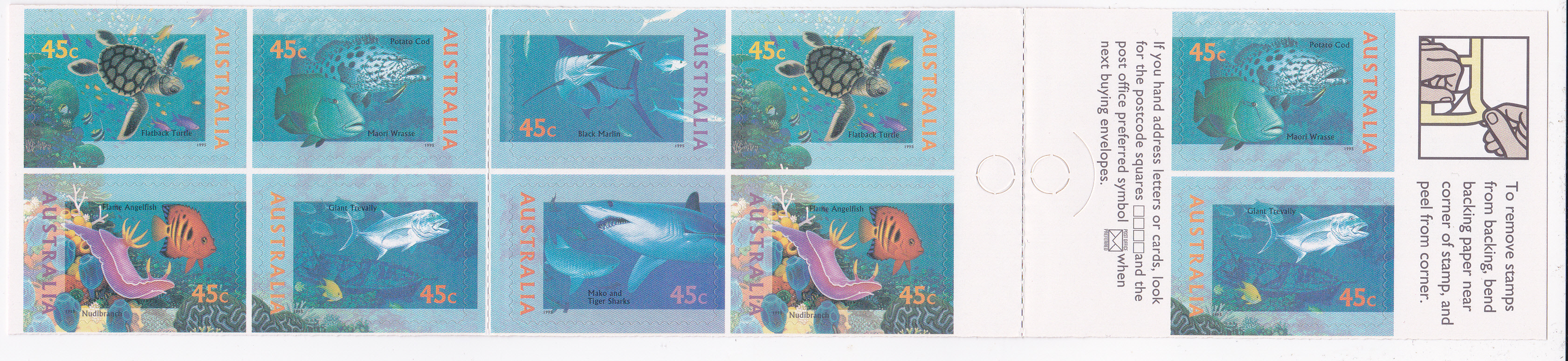 Es folgt die Marke (MiNr 1519) mit dem Gefleckten Riesenzackenbarsch (Epinephelus tukula, Syn.: Epinephelus fuscoguttatus, Serranus dispara, Serranus fuscoguttatus; engl.: Potato Cod) und dem Napoleon-Lippfisch (Cheilinus undulatus; engl.: humphead wrasse, Māori wrasse, Napoleon wrasse, Napoleon fish oder Napoleonfish.