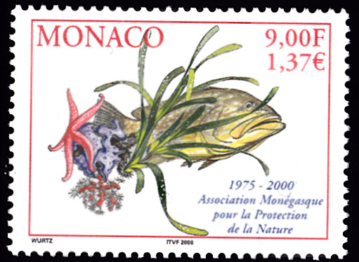 Diese Marke aus Monaco (MiNr 2523) anlässlich "25 Jahre Nationale Naturschutzorganisation" zeigt uns einen Zackenbarsch, einen Seestern, einen Korallenstock und eine Rote Edelkoralle.
