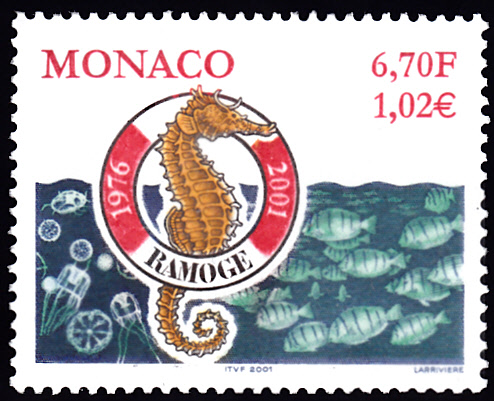 Auf dieser Marke aus Monaco (MiNr 2534) zum Anlass "25 Jahre Küstengewässerschutz-Abkommen zwischen Saint-Raphaël, Monaco und Genua (RAMOGE)" sind ein Seepferdchen in Rettungsring und weitere Meereslebewesen abgebildet.