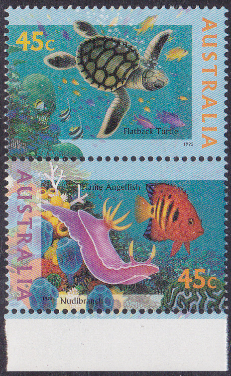 Diese Marke wurde mit einer zweiten Marke aus der Serie "Unterwasserwelt" senkrecht zusammenhängend gedruckt. Hier ein senkrechtes Paar: