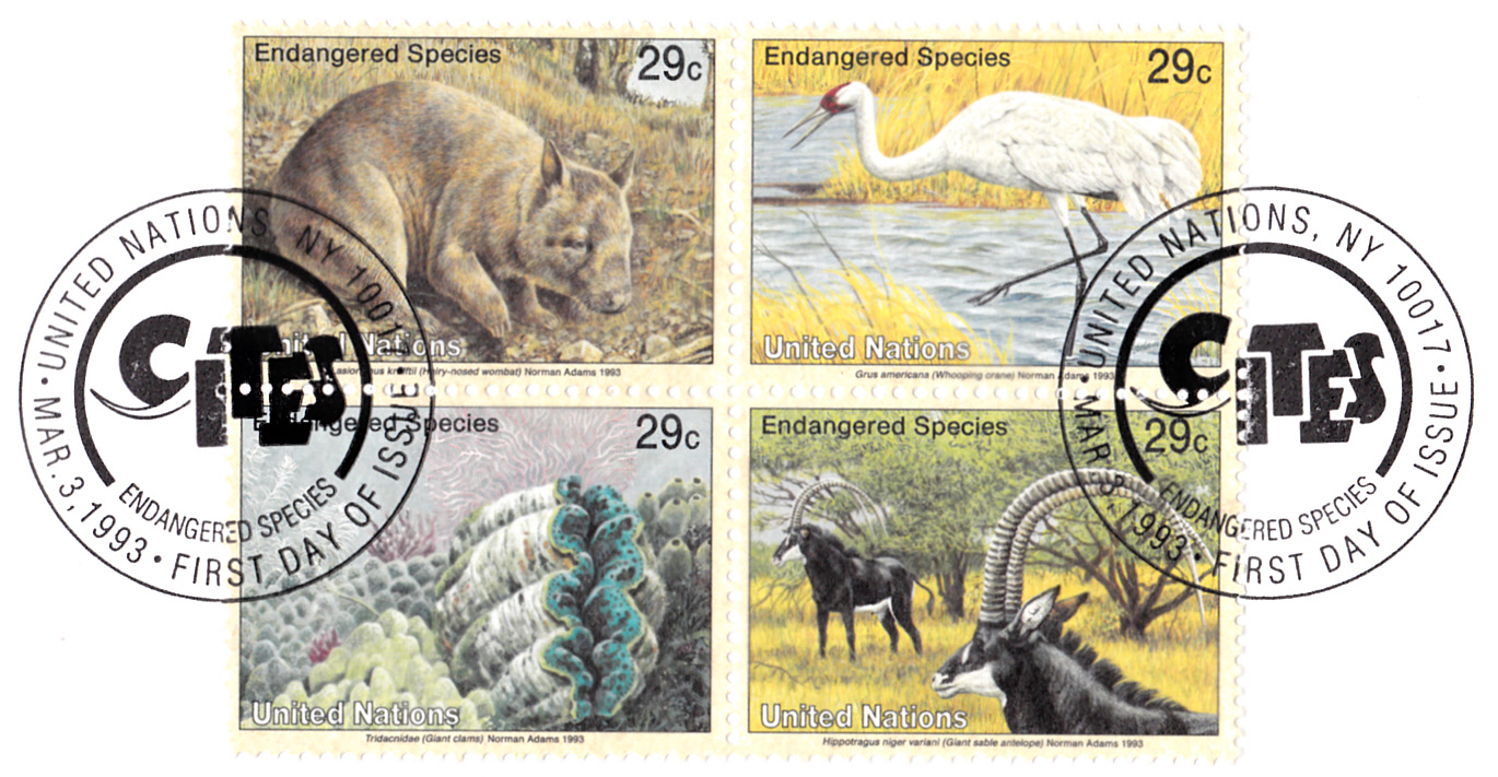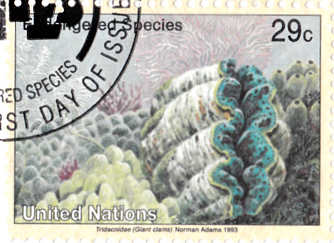 In der Serie "Gefährdete Arten Fauna" erschien bei der Postverwaltung der Vereinte Nationen New York 1993 diese Marke (MiNr 646) mit einer Riesenmuschel (Tridacna sp.).