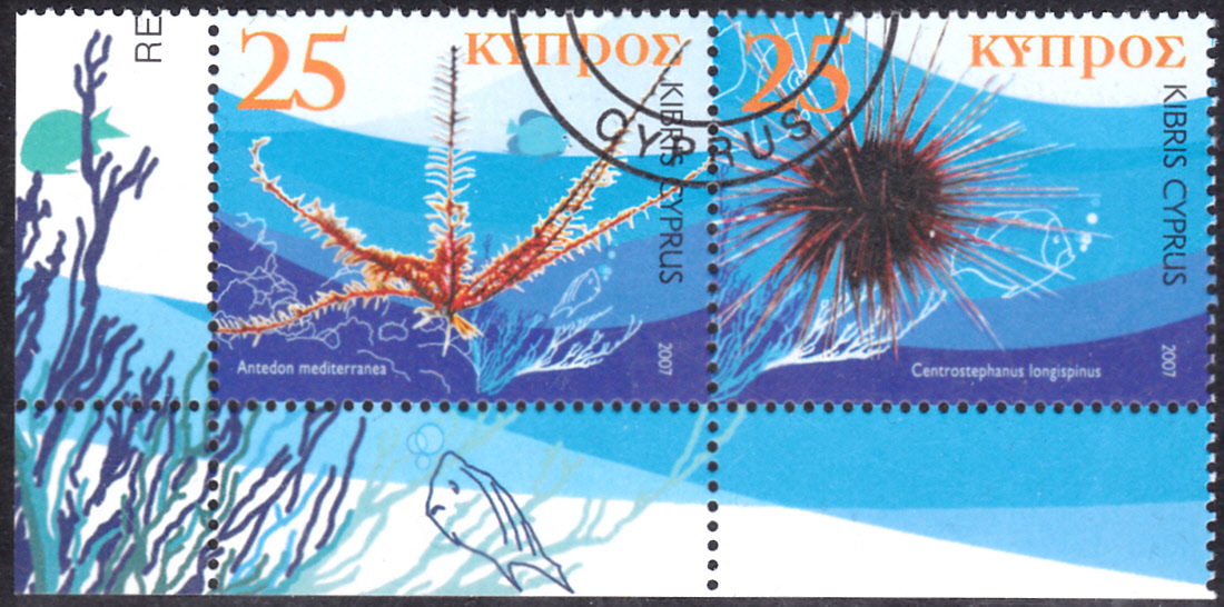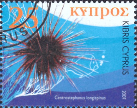 Auf dieser Marke aus Zypern (MiNr 1088) wird ein Langstacheliger Diademseeigel (Centrostephanus longispinus) gezeigt.
