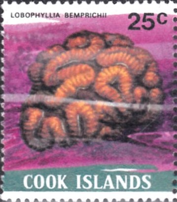 Diese Marke der Cook-Inseln (MiNr 731) zeigt eine Doldenkoralle (Lobophyllia hemprichii). Auf der Marke um im Michel ist der Name falsch geschrieben: Lobophyllia bemprichii.