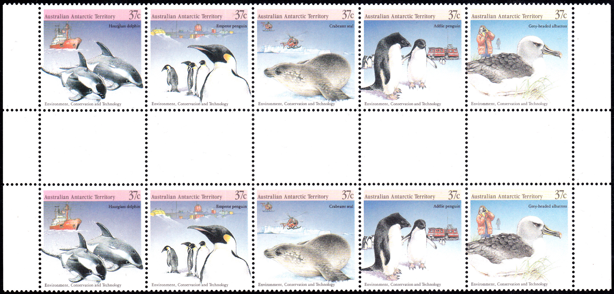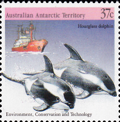 Auf dieser Marke aus den Australischen Gebieten in der Antarktis (MiNr 79) sind zwei Stundenglasdelfine (Lagenorhynchus cruciger) zu sehen.