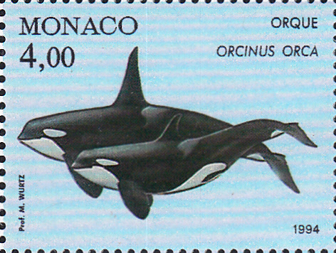 Auf dieser Marke aus Monaco (MiNr 2169) werden zwei Schwertwale abgebildet.